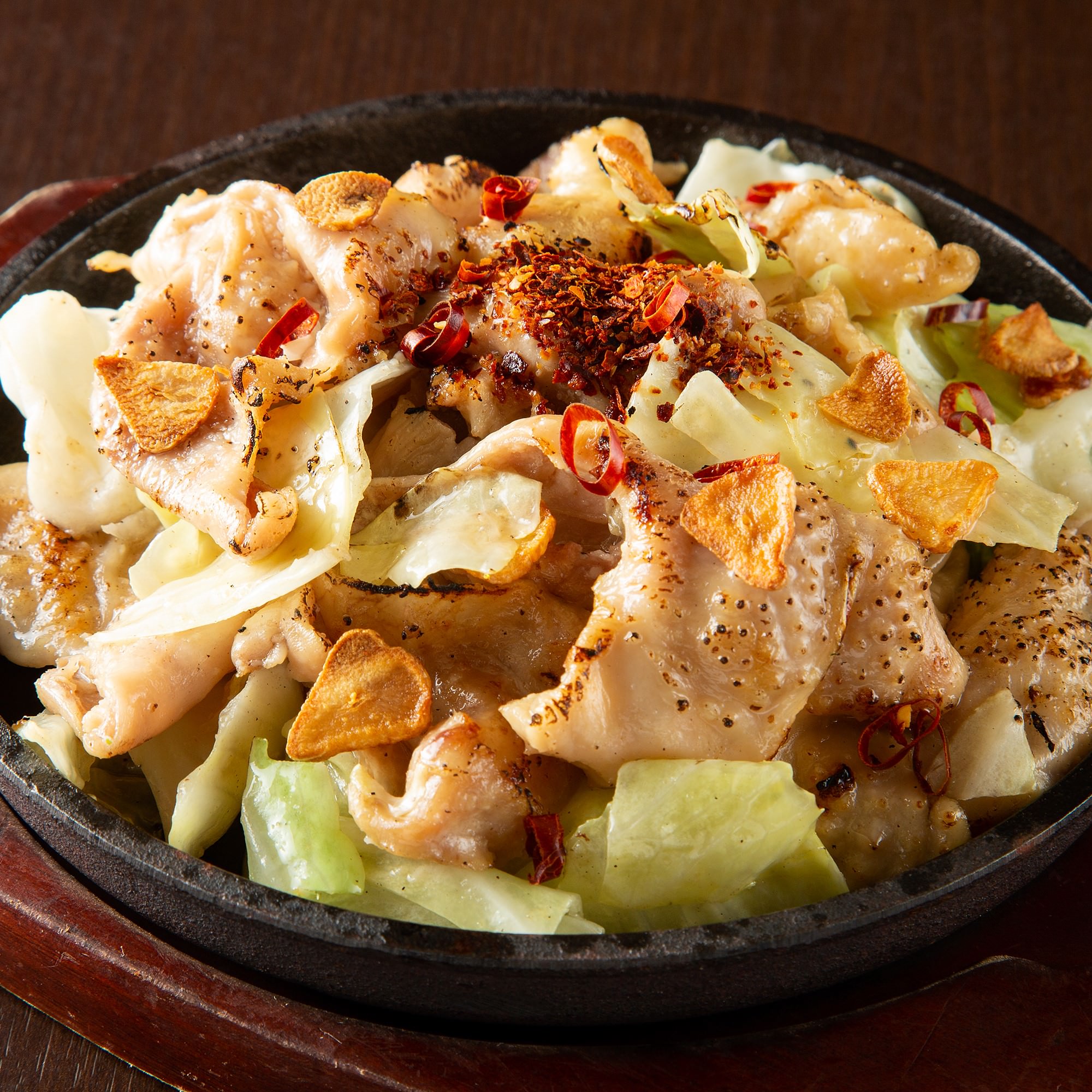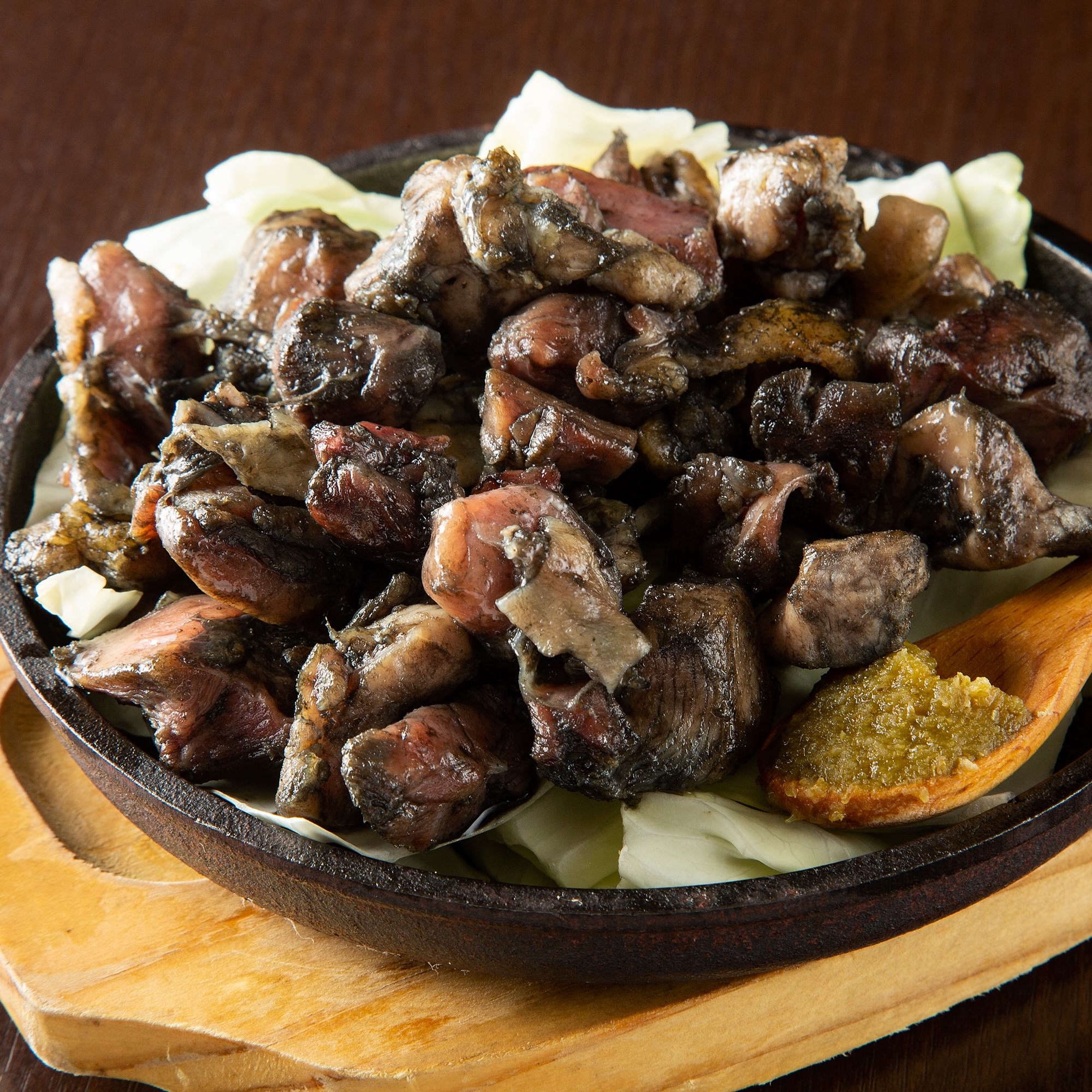 噛むほどに、肉汁あふれるピリ辛ホルモン焼き